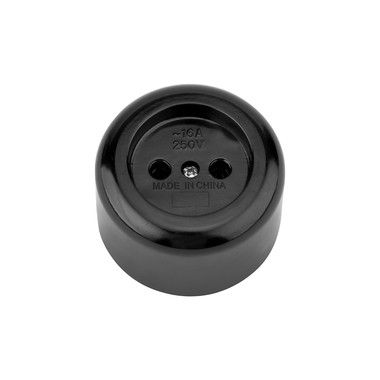 Розетка штепсельная карболитовая открытой установки без заземления предназначена для организации подключения различных электрических приборов напряжением до 250 В и током до 16 А при двухпроводной системе питания. Корпус розетки выполнен из карболита, что придает ему абсолютную негорючесть, химическую стойкость и высокие диэлектрические свойства. Основание изделия выполнено из керамики и оснащено латунными токопроводящими подпружиненными контактами с винтовыми контактными зажимами для присоединения проводников. Розетка не имеет корпуса на поверхности монтажа. Подпружиненные контакты изделия плотно удерживают стержни сетевой вилки, что обеспечивает более надежный контакт. Для монтажа розетки на поверхности необходимо открутить винт с лицевой стороны розетки. Вынуть керамическое основание. Затем установить керамическое основание на поверхность, зафиксировав его двумя винтами или саморезами (в комплекте не поставляются), подключить к клеммам проводник. Для прохождения провода в розетку необходимо выломать специально подготовленную боковую поверхность корпуса по выемке. Установить корпус на керамическое основание. Розетка легко монтируется, имеет высокую надежность и долгий срок службы. Для обеспечения безопасности, все детали, соприкасающиеся с токоведущими частями, выполнены из огнеупорного материала, устойчивого к температуре до +850 ⁰С.