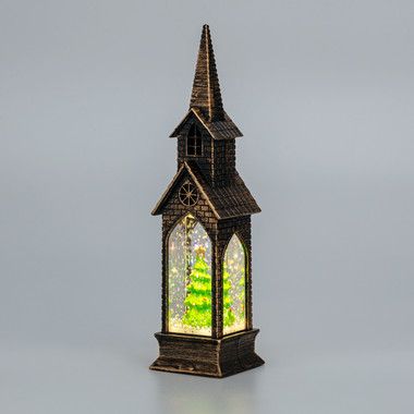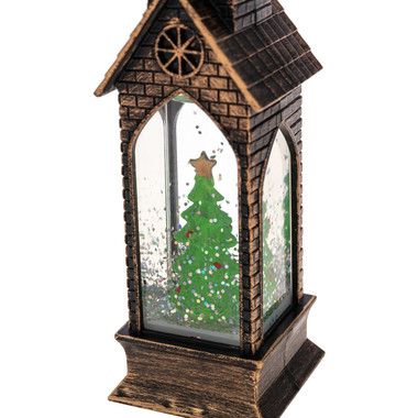 Светильник с эффектом снегопада и подсветкой выполнен в бронзовом цвете, внутри находится фигурка Новогодней елки.
