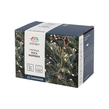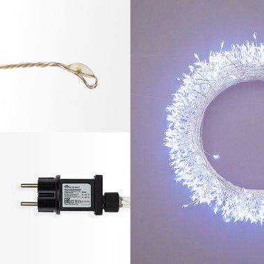 Гирлянда состоит из тонкого провода длиной 20 метров, с расположенными на нем 1000 белыми долговечными светодиодами.