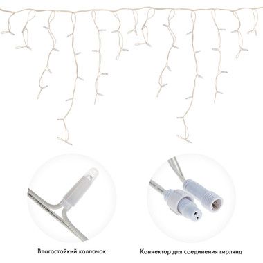 Гирлянда имитирует сосульки и может послужить оригинальным решением при украшении карнизов, арок, фасадов зданий, витрин магазинов, а также стать эффектным элементом декора внутри помещений.