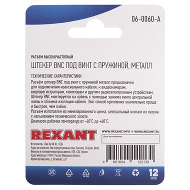 Разъём штекер BNC под винт с пружиной металл предназначен для подключения коаксиального кабеля, к видеокамерам, видеорегистраторам, мониторам и другим радиоэлектронным устройствам. Штекер BNC монтируется на кабель с помощью зажима винта центральной жилы и обжима изоляции кабеля. Этот способ крепления значительно проще и быстрее, чем пайка, но его надежность и качество соединения остаются на неизменно высоком уровне. Разъем изготовлен из никелированного цинка, центральный контакт из латуни с напылением технического золота,