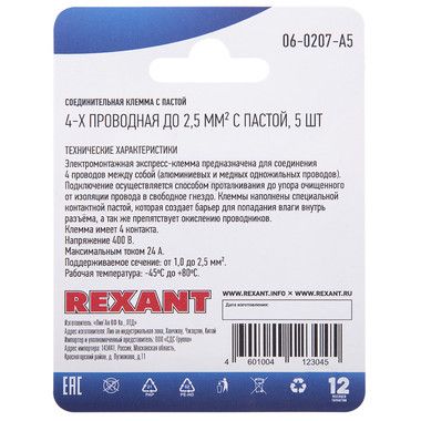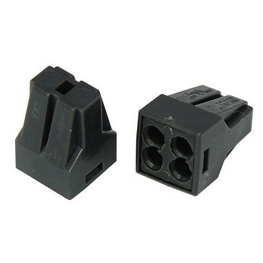 Электромонтажные экспресс-клеммы предназначены для соединения 4 проводов между собой (алюминиевые и медные как одножильные, так и многожильные). Подключение осуществляется способом проталкивания до упора очищенного от изоляции провода в свободное гнездо. Клеммы наполнены специальной контактной пастой, которая создает барьер для попадания влаги внутрь разъёма, а так же препятствует окислению проводников. Клемма имеет 4 контакта, напряжение 400 В, Максимальным током 24А,