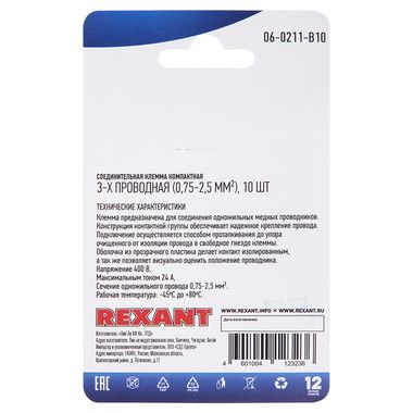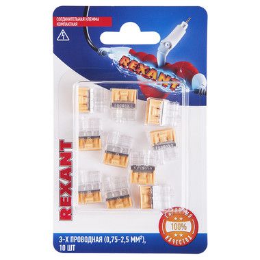 Компактная универсальная 3-проводная клемма в прозрачном корпусе. Клемма предназначена для соединения одножильных медных проводников. Конструкция контактной группы обеспечивает надежное крепление провода. Подключение осуществляется способом проталкивания до упора очищенного от изоляции провода в свободное гнездо клеммы. Оболочка из прозрачного пластика делает контакт изолированным, а так же позволяет визуально оценить положение проводника. Напряжение 400 В,