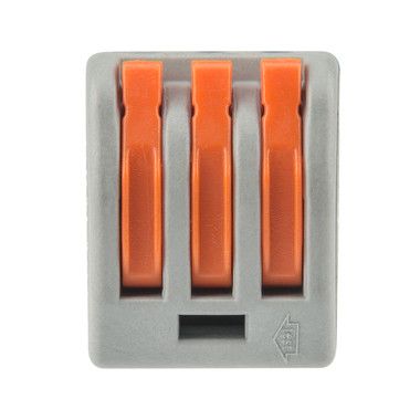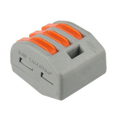 Соединительная многоразовая клемма REXANT с плоско-пружинным зажимом предназначена для соединения медных одножильных и многожильных зачищенных проводников тонкого сечения. Перед монтажом с соединяемым проводником необходимо снять изоляцию в соответствии с обозначениями на корпусе клеммы. Зачищенный участок с монтажной стороны не должен иметь сильных изгибов. Проводник вводится в свободное гнездо клеммы с предварительно поднятым оранжевым рычажком, после чего рычаг опускается в исходное положение. Контакт осуществляется путем зажима проводника пластиной. Конструкция предотвращает случайное размыкание контакта. Специальное технологическое отверстие на корпусе клеммы предназначено для проверки соединения тестером-пробником или щупом мультиметра. Корпус из пластика делает контакт изолированным. Извлечение проводника (демонтаж) осуществляется перечисленными действиями в обратном порядке.