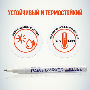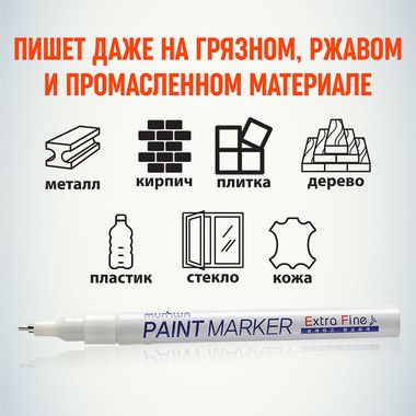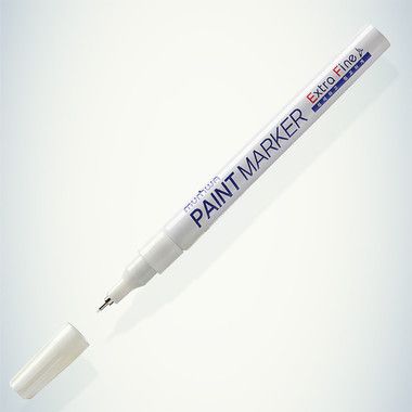 Водостойкий маркер-краска MunHwa «Extra Fine Paint Marker» лаковый на нитро-основе. Используется для маркировки изделий из: пластика, дерева, металла, камня, кирпича, стекла, резины, кожи. Применяется при реставрации, декорировании, ремонте и строительстве. Чернила поступают дозированно, ровно ложатся на поверхность. Перед использованием необходимо встряхнуть маркер и в вертикальном положении надавить стержнем на поверхность: дать краске пропитать пишущий узел. Игольчатая форма наконечника не оставляет царапин при письме. Чернила высыхают на поверхности в течение 40-60 секунд. Корпус выполнен из прочного алюминия.
