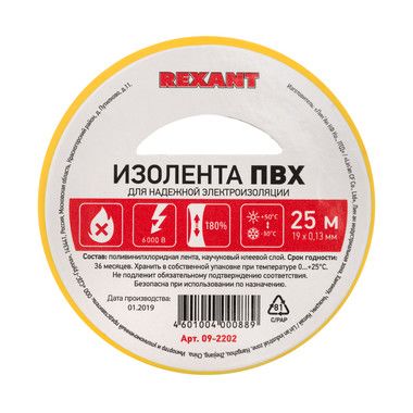 Изолента REXANT предназначена для электрической изоляции, цветной маркировки, соединения, защиты от внешних факторов и герметизации кабелей, проводов и шнуров.
