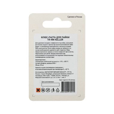 Флюс-паста TR-RM KELLER. Все свойства флюса абсолютно такие же, как у канифоли, флюс не содержит ни одного активатора, кроме канифоли. Температурный диапазон пайки снижен. Является полностью гидрофобным, что исключает коррозию.