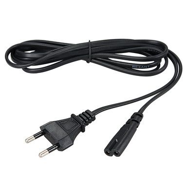 Шнур сетевой 1.8 м 2x0.5 мм² REXANT предназначен для подключения к сети переменного тока (AC) с напряжением 220 B аудио- и видеоаппаратуры, источников питания ноутбуков, игровых консолей и других приборов, имеющих штыревой сетевой разъем типа С8 (известен из-за его формы как «восьмерка»). Данный сетевой шнур (IEC cord) оснащен с одной стороны литой неразборной плоской вилкой (евро), с другой — литым гнездовым неполяризованным разъемом типа C7 (евроразъем) и двухжильным проводом с сечением жил 0.5 мм².