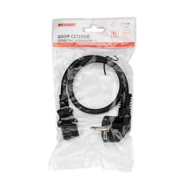 Данный шнур IEC оснащен с одной стороны неразборной литой вилкой (евростандарт) с заземляющим контактом, с другой — литым трехконтактным гнездовым разъемом C13 и трехжильным проводом с сечением жил 1,5 мм².