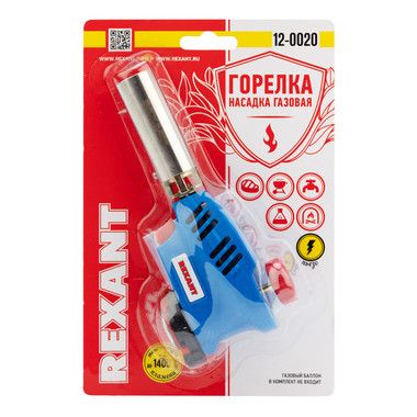 Газовая горелка-насадка REXANT GT-20 с пьезоподжигом. Отличается от аналогичных горелок в модельном ряду Rexant строением форсунки. Благодаря наличию пьезоподжига, такой горелкой удобно пользоваться одной рукой. Рекомендуется для работы с термоусаживаемыми трубками, перчатками, муфтами; для плавления и сварки изделий из пластиков и стекла; удаления краски; обработки поверхностей на производстве и в лабораторных условиях; для разморозки замков, водопроводных труб, продуктов; для копчения продуктов или карамелизации десертов; для украшения процесса подачи блюд; для работ в саду и огороде, для быстрого и экологичного поджига дров, угля.