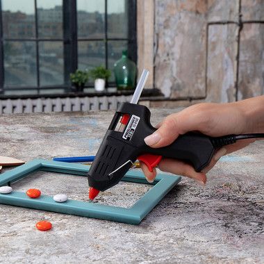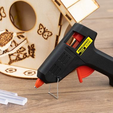 Принцип работы: клеевой стержень плавится в металлической камере с помощью нагревательного устройства и для точного дозированного нанесения при нажатии на курок подается из сопла на склеиваемую поверхность. Используется в моделировании, рукоделии, при выполнении мелкого ремонта, для изготовления упаковочной и сувенирной продукции, монтажа электрических плат, декорирования, и т.п.