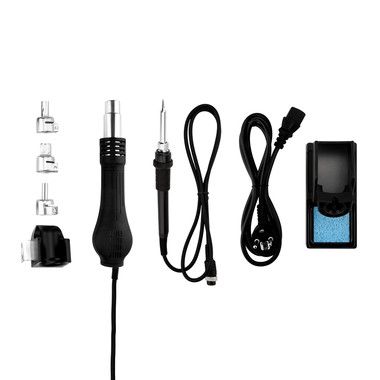 Комплектация станции: основной блок, термофен, паяльник, держатель паяльника, держатель термофена, губка для очистки жала паяльника (в ложементе), 3 насадки для термофена разного размера.
