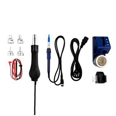 Комплектация станции: основной блок, сетевой шнур, термофен, паяльник, держатель паяльника, держатель термофена, губка для очистки жала паяльника (в ложементе), 3 насадки для термофена разного размера, 1 пара проводов для БП.