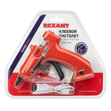 Пистолет клеевой REXANT (10 Вт, Ø7 мм, «ЭКСПЕРТ», аккумуляторный) предназначен для прочной фиксации поверхностей с помощью расплавленной клеевой массы.