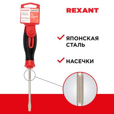 Отвертка шлицевая REXANT предназначена для проведения монтажных и демонтажных работ с резьбовыми соединениями: шурупами, саморезами и т. д. Стержень инструмента выполнен из качественной японской стали с намагниченным наконечником. Отвертка обладает эргономичной трехкомпонентной рукояткой, которая предотвращает скольжение и прокручивание инструмента в ладони и обеспечивает более комфортную работу. В основании инструмента предусмотрено отверстие для подвеса.