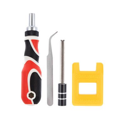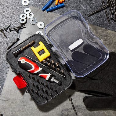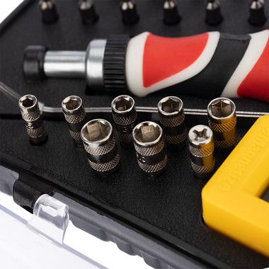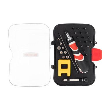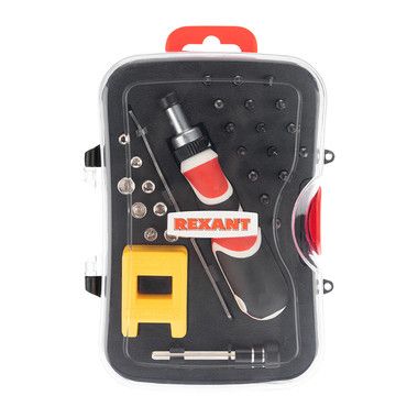 Набор отверток для точных работ REXANT 28 в 1 оптимально подходит для выполнения прецизионных работ в электронике и электромеханике, ремонта телефонов, планшетов, ноутбуков, электронных книг, часов и других популярных приборов, которые используются в быту. Биты выполнены из качественной хромованадиевой стали, обладающей высокой прочностью к механическим повреждениям и образованию ржавчины. Прорезиненная пластиковая рукоятка эргономичной формы не скользит в ладони, что обеспечивает дополнительный комфорт при работе. Отвертка оснащена реверсивным механизмом (реверс по/против часовой стрелки, фиксация). Набор укомплектован дополнительным магнитом для намагничивания бит и насадок. Пинцет с изогнутыми острыми губками помогает работать с мелкими деталями. Набор инструментов и бит поставляется в пластиковом кейсе для удобного хранения и транспортировки.