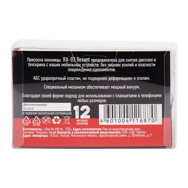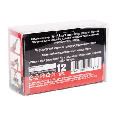Съемник-присоска REXANT RA-03 в форме ножниц предназначен для удаления дисплея и touchscreenа со смартфонов, планшетов, коммуникаторов, PlayStation. Устройство позволяет отделить экран без лишних усилий, исключает опасность повреждения компонентов техники. Устройства устанавливаются между двумя присосками, которые прочно закрепляются на корпусе и экране, создавая мощный вакуум. При смыкании рукояток дисплей легко удаляется. Присоски могут фиксироваться и только с одной стороны техники, прямо на экране. Благодаря форме ножниц инструмент подходит для работы с устройствами любых размеров. Корпус съемника-присоски выполнен из ударопрочного пластика. Эргономичные прорезиненные рукоятки имеют рифление, благодаря которым ладонь не скользит при работе.
