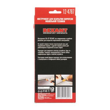 Инструмент REXANT RA-07 предназначен для быстрого и безопасного вскрытия корпусов смартфонов, планшетов, ноутбуков, коммуникаторов, PlayStation. Выполнен из высококачественной стали. Рабочие части инструмента изготовлены из ударопрочного пластика и подходят для ремонта устройств с более хрупкими, мягкими дисплеями. С одной стороны располагается тонкий нож для «поддевания» экрана, с другой – ролик для произведения равномерного отсоединения экрана от корпуса техники.