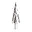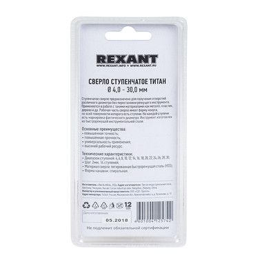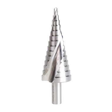 Ступенчатое сверло предназначено для сверления отверстий различных диаметров. Применяется в работе с такими материалами, как: пластик, дерево, металл и др. Хвостовик сверла цилиндрический. На каждой ступени есть маркировка фактического диаметра. Сверло изготовлено из инструментальной легированной стали и покрыто нитридом титана.