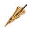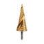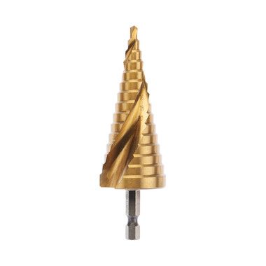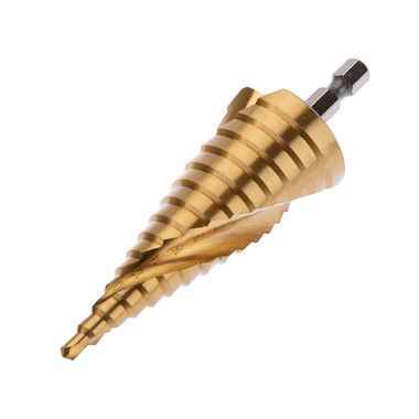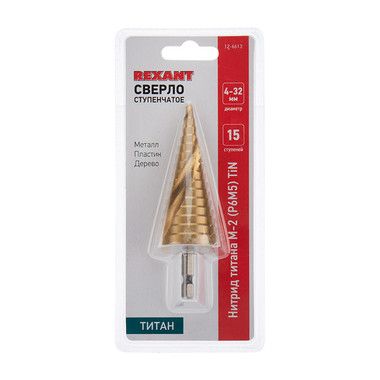 Ступенчатое сверло предназначено для сверления отверстий различных диаметров. Применяется в работе с такими материалами, как: пластик, дерево, металл и др. Хвостовик сверла цилиндрический. На каждой ступени есть маркировка фактического диаметра. Сверло изготовлено из инструментальной легированной стали и покрыто нитридом титана.