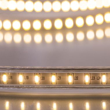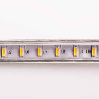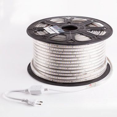 Светодиодная лента 220 В повышенной яркости представляет собой гибкую PCB панель, напоминающую тончайшую ленту, на которую нанесены светодиоды. PCB панель со всех сторон обволакивает прозрачная герметичная изоляция, благодаря которой лента защищена от механических повреждений и может работать находясь под тяжелым воздействием окружающей среды.