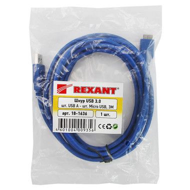 Шнур USB-A (male) – micro USB (male) 3 м 3.0 REXANT предназначен для подключения периферийных и портативных устройств (клавиатуры, мыши, джойстики, аудио- и видеоустройства, устройства хранения информации, сканеры и т. п.) к компьютеру или другой технике, имеющей разъем типа micro USB. C одной стороны шнура располагается штекер разъема USB-A, с другой стороны располагается разъем типа micro USB.
