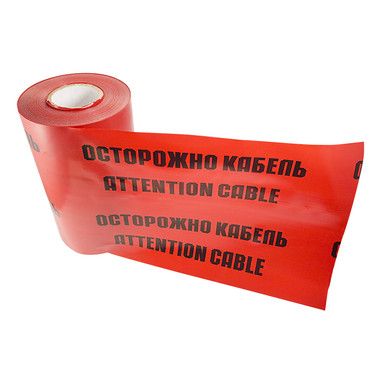 Лента сигнальная «Осторожно кабель» красного цвета, с нанесённым логотипом «Осторожно кабель. Attention cable» черного цвета.