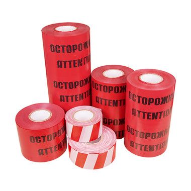 Лента сигнальная «Осторожно кабель» красного цвета, с нанесённым логотипом «Осторожно кабель. Attention cable» черного цвета.