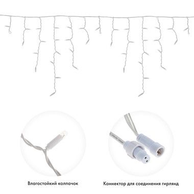Гирлянда имеет белый цвет свечения и предназначена для использования как внутри помещений, так и снаружи.