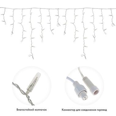 Гирлянда имитирует сосульки и может послужить оригинальным решением при украшении карнизов, арок, фасадов зданий, витрин магазинов, а также стать эффектным элементом декора внутри помещений.