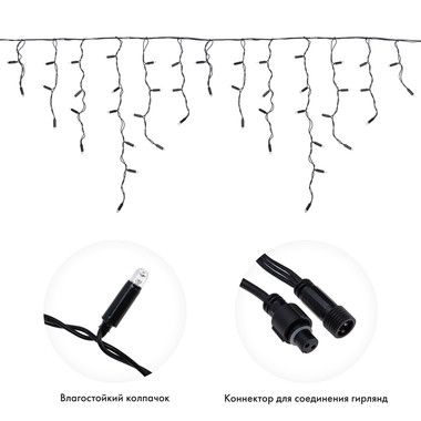 Гирлянда имитирует сосульки и может послужить оригинальным решением при украшении карнизов, арок, фасадов зданий, витрин магазинов, а также стать эффектным элементом декора внутри помещений.