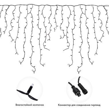 Гирлянда имитирует сосульки и может послужить оригинальным решением при украшении карнизов, арок, фасадов зданий, витрин магазинов, а также стать эффектным элементом декора внутри помещений.