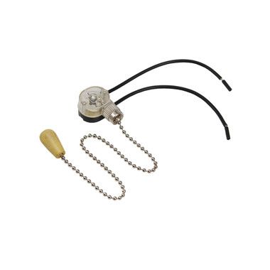 Выключатель для настенного светильника с хромированной цепочкой, проводами и деревянным наконечником.