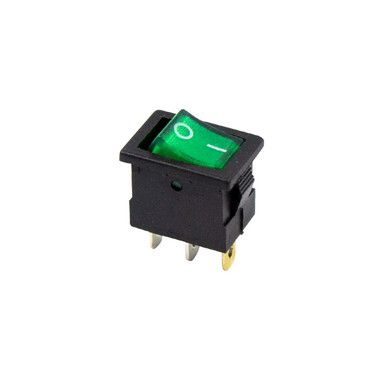Выключатель клавишный 6А (250В) 15А (12В) (3c) ON-OFF зеленый с подсветкой Mini предназначен для коммутации электрических цепей напряжением 12В. Клавишные (Рокерные) выключатели применяются в качестве комплектующих изделий различного электрооборудования (в сетевых фильтрах и удлинителях, аудио-оборудовании, блоках питания, электроустановках на различных производствах, автомобилях, и многих других местах). Такой клавишный переключатель имеет два положения. Принцип действия основан на перемещении клавиши в одну из позиций. Для переключения в нужное положение требуется приложить некоторые усилия на клавишу. Монтаж осуществляется без применения винтов на плоских панелях толщиной от 0.8мм до 3мм. Подключение контактов осуществляется плоской клеммой, либо с помощью пайки.