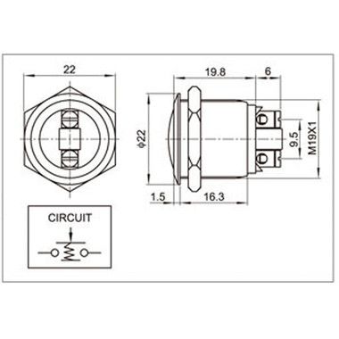 Кнопка антивандальная Ø19 Б/Фикс (2с винт) OFF-(ON) сфера предназначена для коммутации электрических цепей переменного тока напряжением до 250В путем включения-выключения питающего провода. Такие кнопки применяются в местах, где существует большой риск их повреждения (на различных производственных линиях, в лифтовых кабинах, около входной двери и т.д.). Главными отличительными особенностями антивандальной кнопки являются металлическое исполнение и неуязвимость контактной группы, что обеспечит ей долговечное функционирование. Изделие состоит из двух основных частей - лицевой части (головки) и контактной, и имеет пружинный возвратный механизм. Монтаж осуществляется без применения винтов на плоских панелях толщиной от 0.5мм до 10мм. Подключение проводов осуществляется с помощью винтовых зажимов.