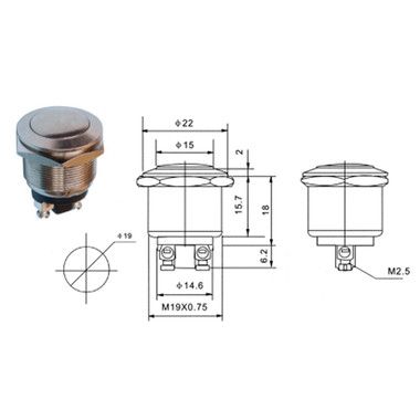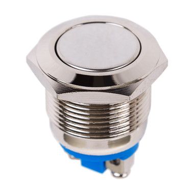 Кнопка антивандальная Ø19 Б/Фикс (2с) OFF-(ON) плоская предназначена для коммутации электрических цепей переменного тока напряжением до 250В путем включения-выключения питающего провода. Такие кнопки применяются в местах, где существует большой риск их повреждения (на различных производственных линиях, в лифтовых кабинах, около входной двери и т.д.). Главными отличительными особенностями антивандальной кнопки являются металлическое исполнение и неуязвимость контактной группы, что обеспечит ей долговечное функционирование. Изделие состоит из двух основных частей - лицевой части (головки) и контактной, и имеет пружинный возвратный механизм. Монтаж осуществляется без применения винтов на плоских панелях толщиной от 0.5мм до 10мм. Подключение проводов осуществляется с помощью пайки или клемм.