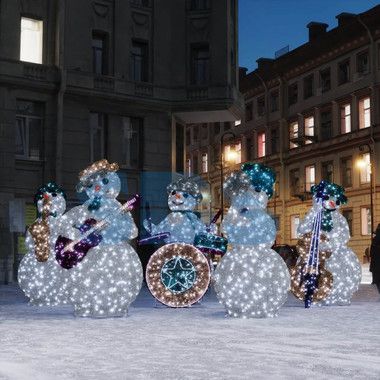 Яркие светодиодные снеговики - захватывающие 3D конструкции, отлично подходящие для украшения городской среды, входных групп, торговых объектов, парковых и пешеходных зон. Изделия состоят из надежного и легкого алюминиевого каркаса, не требующего окрашивания. Поверх него закреплен блестящий и крепкий мишурный ковер на металлической проволоке. Светотехника профессиональной серии с напряжением в 24 Вольта, степенью защиты 65 IP и резиновым проводом абсолютно безопасна для людей и не боится плохих погодных условий, выдерживает температуру до -50 градусов. Тип свечения может быть как статическим так и динамическим. Изящный световой эффект не оставит равнодушными прохожих, а необычная, внушающих размеров мишурная фигура поднимет настроение взрослым и детям, создаст атмосферу Нового года и Рождества.