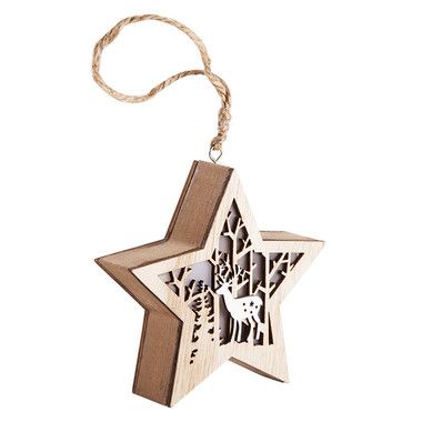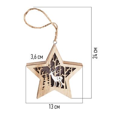 Деревянная фигурка с подсветкой «Звездочка» 24×13×3,6 см — интересное решение для украшения интерьера, которое поможет создать атмосферу уюта и тепла. Изделие выполнено из природной древесины в виде пятиконечной звезды, переднюю часть украшают резные фигурки оленя и деревьев. Композиция подсвечивается одним ярким диодом, излучающим теплый белый свет. Светодиод питается от одной батарейки CR2032, идущей в комплекте. В верхней части есть мягкая джутовая нить для подвешивания.