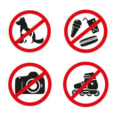 Наклейки предназначены для размещения на входных дверях магазинов и прочих организаций и информируют о том, что на данной территории или объекте запрещено вести фото- и видеосъемку, находиться на роликовых коньках, находиться с продуктами питания в открытой упаковке, находиться с животными.