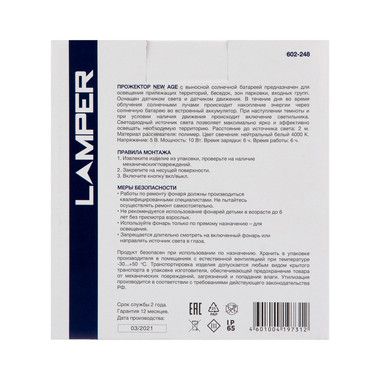 Поворотный прожектор Lamper с линзованной оптикой, ультраяркими диодами и отдельной выносной солнечной панелью позволяет использовать его как внутри, так и вне зданий, для въездных групп, для подсветки пространств внутри помещений. Приятное теплое белое свечение будет радовать долгое время благодаря прочной конструкции и долговечным LED диодам.