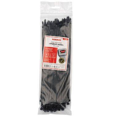 Хомут нейлоновый (кабельная стяжка) 300х4,8 мм чёрный «Тройной замок» предназначен для крепления или обвязки в жгут кабелей и проводов, крепления гибких гофротруб, а также других предметов к несущей поверхности или для соединения между собой. Используется при проведении электромонтажных работ, при монтаже структурированных кабельных систем, для бытовых нужд, а также в других отраслях народного хозяйства.