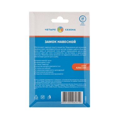 Навесной замок ЧЕТЫРЕ СЕЗОНА идеально подходит для защиты вашего имущества от непрошенных гостей. Замок пригодится для запирания гаражных ворот, распределительных щитков, складов и других объектов.