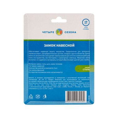 Навесной замок ЧЕТЫРЕ СЕЗОНА идеально подходит для защиты вашего имущества от непрошенных гостей. Замок пригодится для запирания гаражных ворот, распределительных щитков, складов и других объектов.