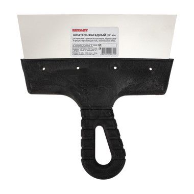 Фасадный шпатель оснащен эргономичной пластмассовой ручкой с рифлением, которая обеспечивает надежный хват инструмента, при использовании, в том числе, в грубых строительных перчатках. Основной рабочей частью шпателя является металлическое полотно, поэтому для производства шпателей мы используем нержавеющую сталь марки AISI 201 толщиной 0,4 мм высоконагартованную (1500 н/мм). Сталь данной марки обладает улучшенными механическими свойствами, исключающими деформацию полотна в процессе работы.