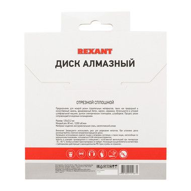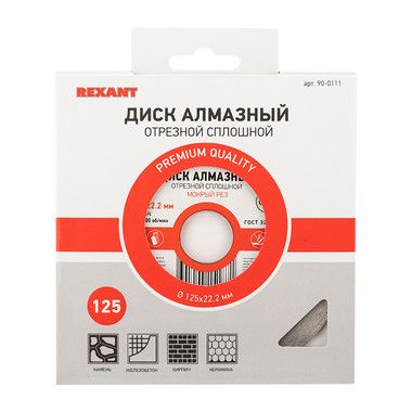 Диск алмазный отрезной сплошной 125x22.2 мм REXANT предназначен для мокрой резки строительных материалов, таких как природный и искусственный камень, армированный бетон, кирпич, керамика. Используется в угловой шлифовальной машине, ручном электрическом плиткорезе, штроборезе.