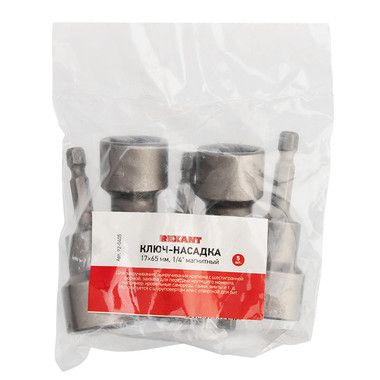 Ключ-насадка 17х65 мм, 1/4" магнитная для закручивания кровельных саморезов, болтов и гаек. Магнит впрессован внутри головки насадки, благодаря чему закручиваемый крепеж надежно фиксируется во время работы. Применяется с шуруповертом, дрелью или отверткой.