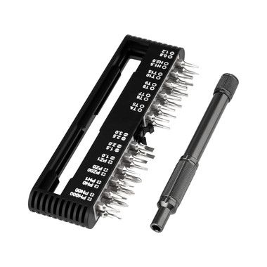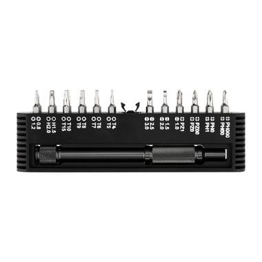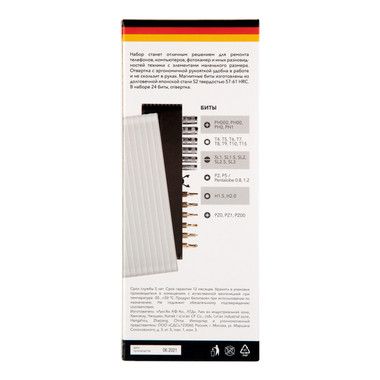 В комплекте отвертка с 24 битами: SL1 , SL1.5, SL2, SL2.5, SL3, PH0, PH1, PH00, PH000, PZ0, PZ1, PZ00, T4, T5, T6, T7, T8, T9, T10, T15, H1.5, H2.0, P2, P5