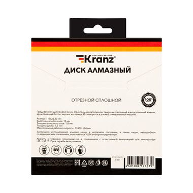 Диск алмазный отрезной сплошной 115x22.2 мм KRANZ предназначен для мокрой резки строительных материалов, таких как природный и искусственный камень, армированный бетон, кирпич, керамика. Используется в угловой шлифовальной машине, ручном электрическом плиткорезе, штроборезе.