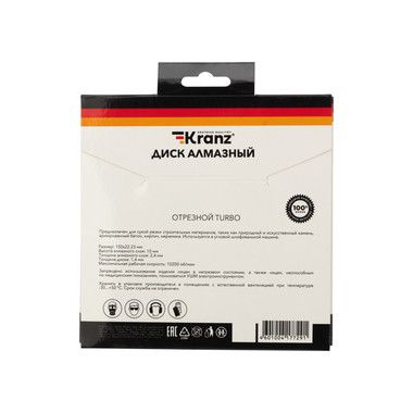 Диск алмазный отрезной Turbo 150x22.2 мм KRANZ предназначен для сухой резки строительных материалов, таких как природный и искусственный камень, армированный бетон, кирпич, керамика. Используется в угловой шлифовальной машине, ручном электрическом плиткорезе, штроборезе.