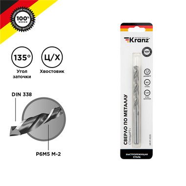 Сверло по металлу KRANZ соответствует стандартам профессиональной оснастки и используется во время различных ремонтных работ. Предназначено для сверления отверстий в нержавеющей и жаростойкой стали, легированной и нелегированной стали, сером чугуне, стальном литье, кислотостойкой стали, металлокерамике, цветных металлах и твердой пластмассе при помощи дрели с цилиндрическим креплением, которое используется в большинстве электроинструментов бытового и профессионального назначения. Изделие выполнено из качественной стали, что обеспечивает долгий ресурс работы и высокую производительность, а также препятствует быстрому нагреву во время использования. Конструкция со стабилизирующей спиралью сохраняет точное положение оснастки во время сверления, что гарантирует ровные и аккуратные отверстия. Заточка режущей части под углом 135 градусов способствует эффективному входу в материал, что увеличивает цикл службы оснастки и уменьшает износ бура. Оснастка выпускается на современном производстве, что снижает возможность изготовления бракованных изделий. Технологичные сверла рассчитаны на долгий срок службы, а стандарт DIN 338 гарантирует качество. Ресурс использования заметно увеличивается при использовании СОЖ. Диаметр хвостовика соответствует диаметру сверла.
